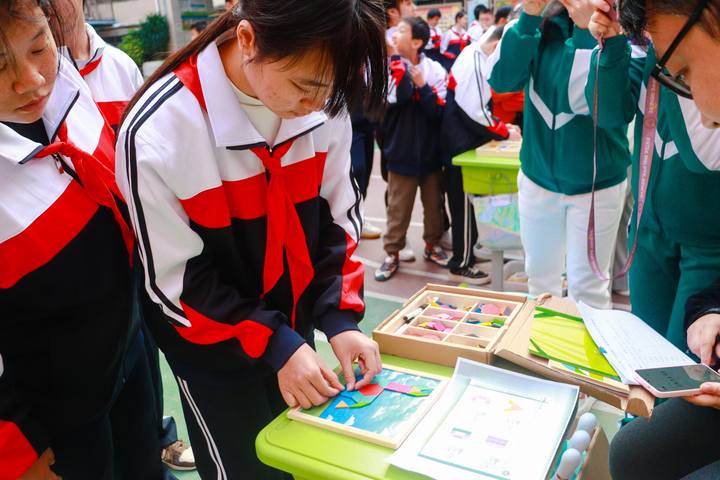 “看!我的纸飞机飞得好远!”操场一侧,一群孩子正兴奋地调试着自己折叠的纸飞机,比比谁的飞得更稳更远。不远处,“向阳七巧板”区域里,另一群孩子们专注地拼搭着彩色几何图形,创造出一个个充满想象力的图案。这些看似简单的项目,实则蕴含着空气动力学、几何对称等科学原理,在趣味体验中悄然点燃孩子们对科技的好奇。学生们在赛事中不仅锻炼了动手能力、专注力,更学会了坚持与协作,生动诠释了“向阳、自信、合作、拼搏”的精神。