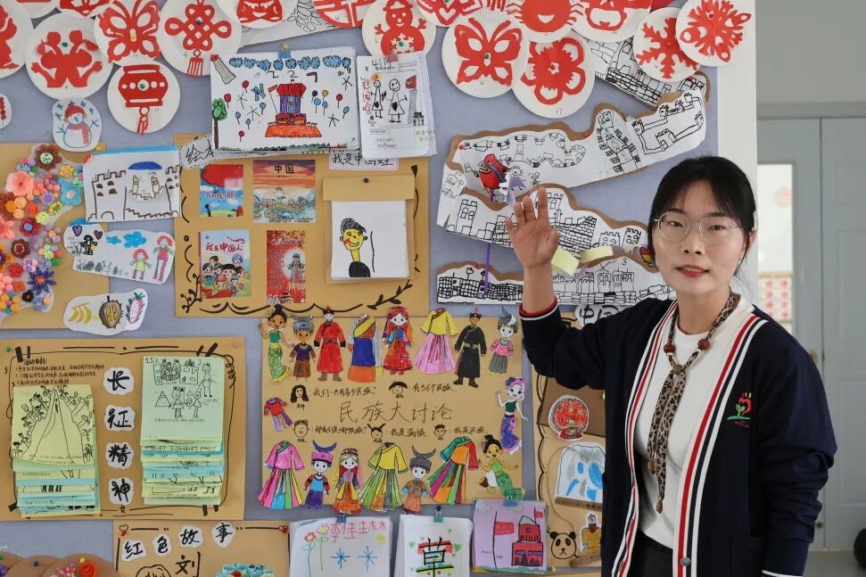 在大班主题“我是中国娃”活动中,老师们精心设计,将“名字的秘密”“向‘筷’乐出发”“皮影戏”等班本活动融入环境创设,串联起汉字文化、航天梦想与祖国山河等内容。从探寻姓名由来、解锁汉字趣味,到聆听仓颉传说、触摸象形文字,体验活字印刷;从激发火箭好奇,到共话航天梦想、畅想祖国未来;再到通过《花花游中国》绘本延伸,认识长城、喜马拉雅山、天安门广场的壮美风貌——每一处布置都蕴含教育匠心。这不仅是一次知识的传递,更是一场情感的共鸣与价值观的培育,让民族自豪感在孩子心中深深扎根。